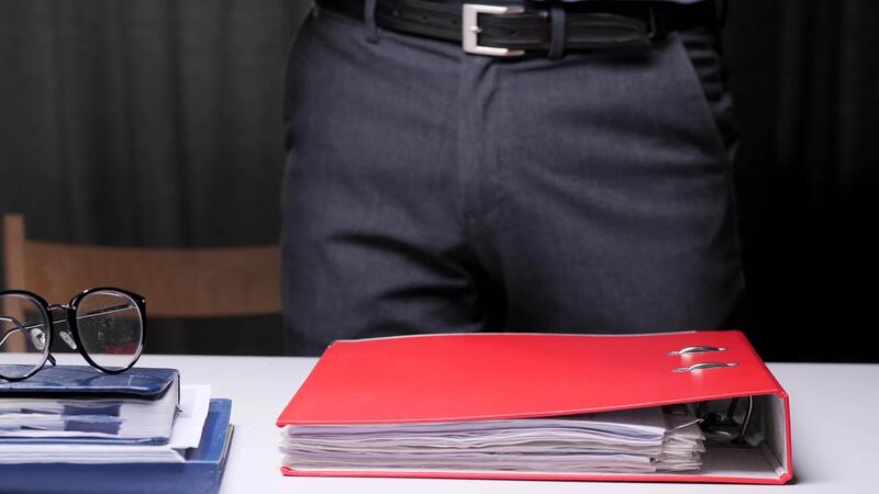 Boss gives an assignment to an office worker. Overload of work in the office. Archive of documents in binder folders. men stack folders with documents on the desk. Concept of document archive Pro Video