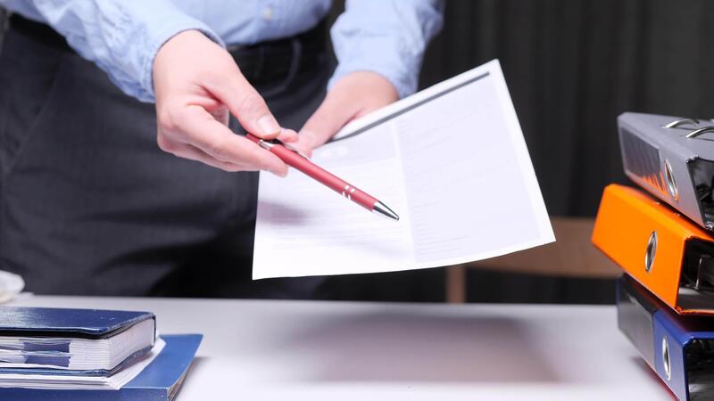 Confident office worker showing where to sign on document, emphasizing importance. Neat desk, binders, notebook convey professionalism Pro Video