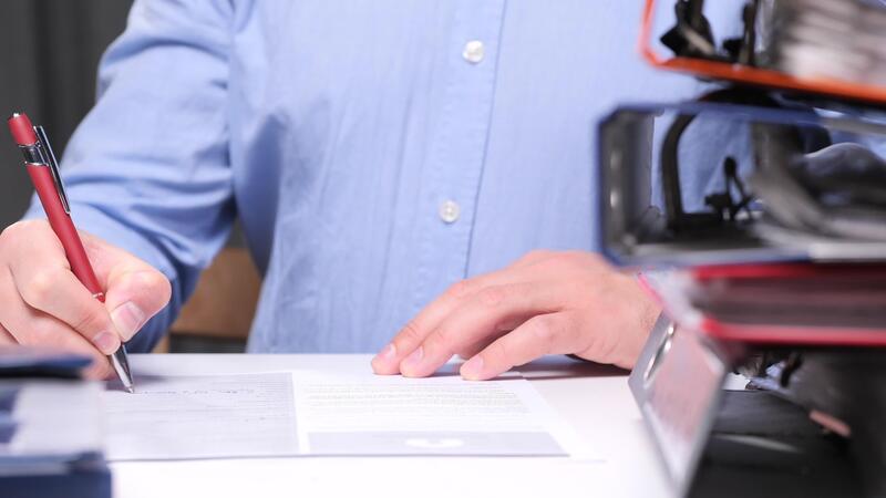 Office worker is diligently signing a document at a desk, with a stack of files subtly blurred in the foreground, emphasizing the focus on the task at hand. Office worker signing a document Pro Video