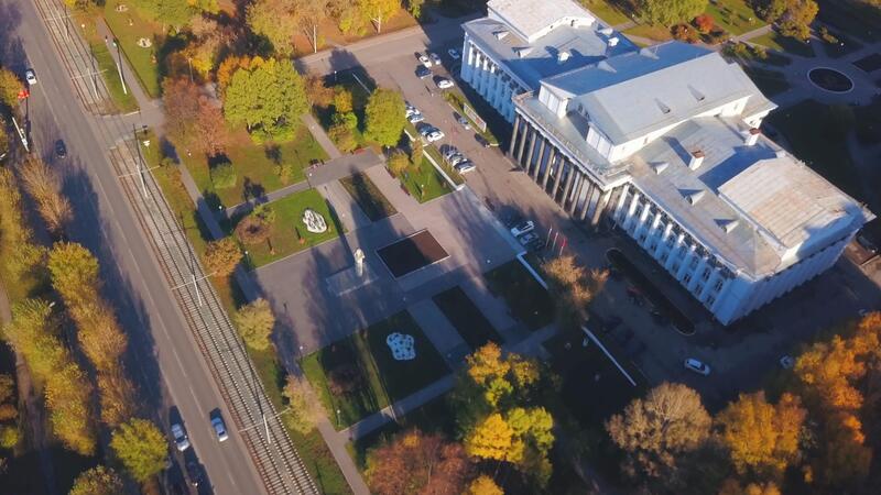 Top view of university building with autumn park. Clip. Beautiful landscape of autumn trees and old building with columns. Old building with columns with autumn forest on sunny day Pro Video
