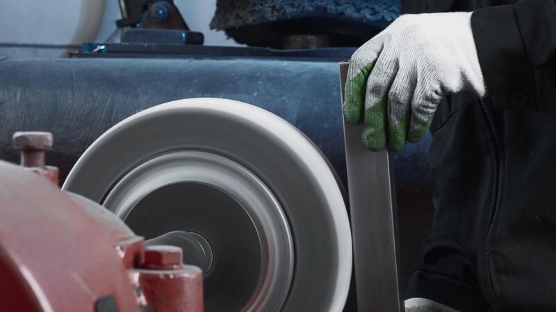 Polishing of steel parts in factory with rotating machine. Creative. Polishing of steel part on rotating machine. Polishing machine with metal part for assembly at factory Pro Video
