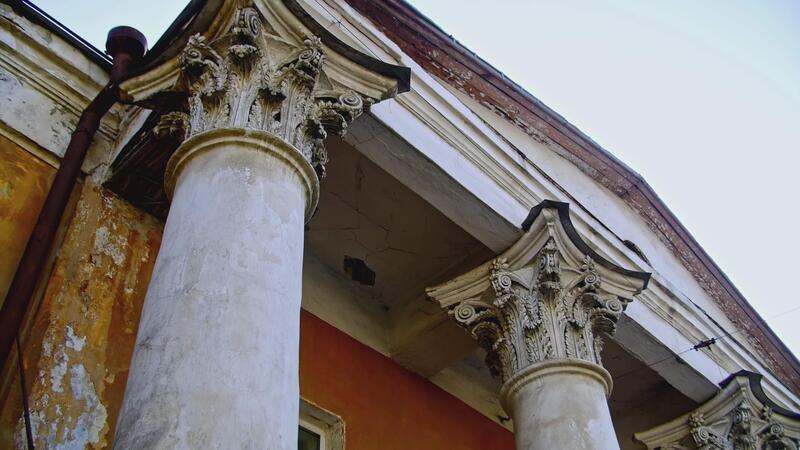 Building residence facade in classical style of architecture. Stock footage. Low angle view of old facade of a building with columns. Pro Video
