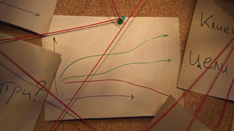 Board with notes and threads. Stock footage. Rebus on notes with red thread. Close-up of mysterious images on notes with red thread in night office Pro Video