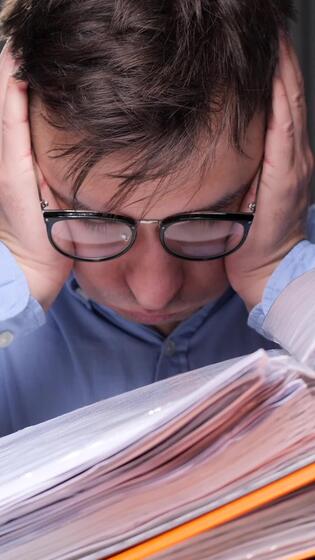 vertical an office worker overloaded with work with documents is tired and clutches his head. The man is upset and clutches his head from the amount of work that has not been done. Pro Video