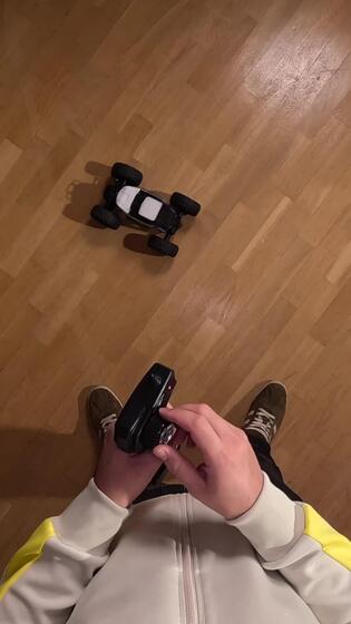 vertical Person holding a remote control while playing with a radio controlled car on a parquet floor, seen from a first-person perspective. A man throws a radio controlled car on the floor Pro Video