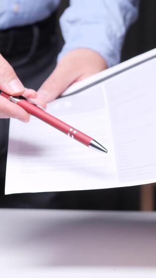 vertical Confident office worker showing where to sign on document, emphasizing importance. Neat desk, binders, notebook convey professionalism Pro Video