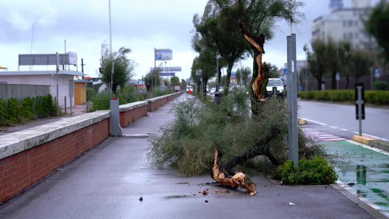 Tree branches and trunk lie on sidewalk against passing cars Pro Video