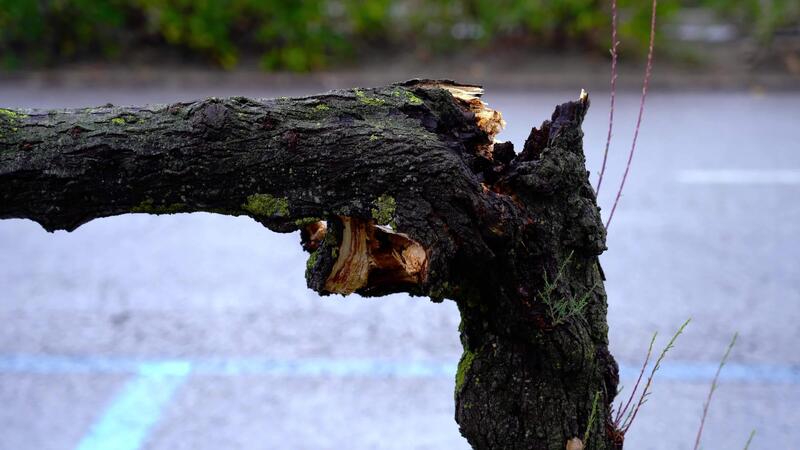 Tree trunk broken by wind against roadway and passing car Pro Video