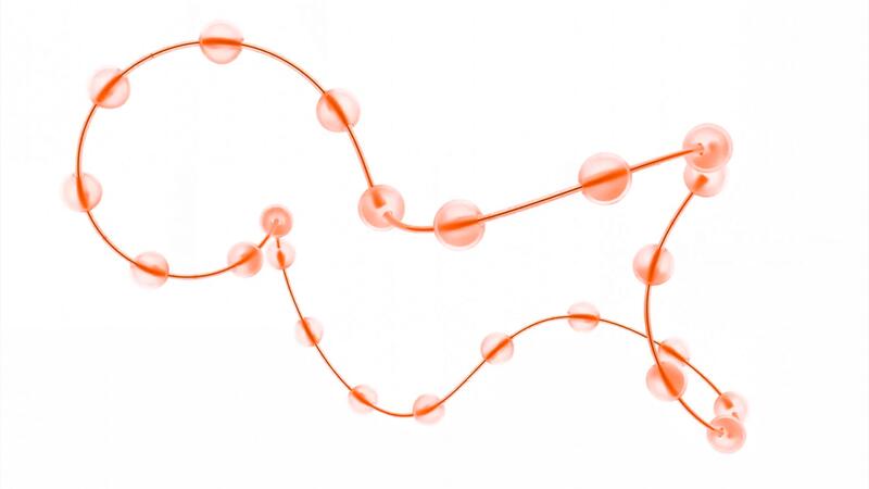 Abstract curved line with colorful neon illuminated spheres. Design. Transparent balls running fast along the string. Pro Video