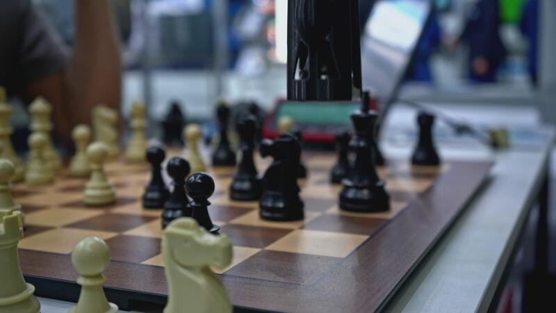 Man is playing chess with robot. Media. Man is playing chess against robot at exhibition. Artificial intelligence technologies versus humans Pro Video