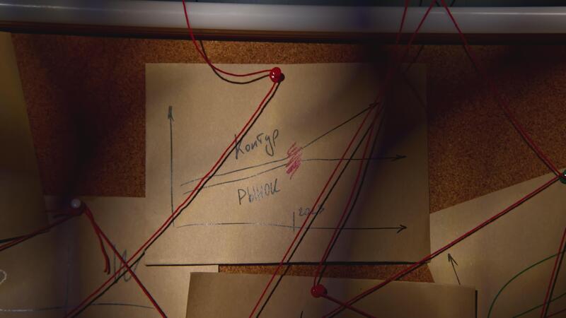Notes with red thread on idea board. Stock footage. Close-up notes with inscriptions on board with rebus. Mysterious blackboard with notes and red thread in night office Pro Video