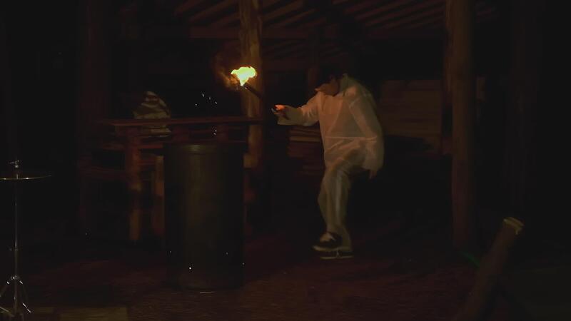 Man with torch in forest at night. Clip. Creepy man with burning torch in dark forest. Ritual torch in hands of frightening man in forest Pro Video