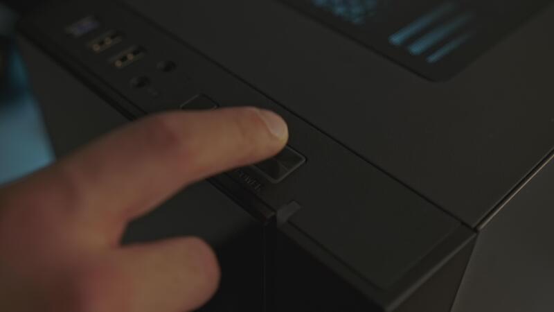 Close-up of man pressing computer start button. Clip. Man turns on modern computer. Gaming professional PC with beautiful design Pro Video