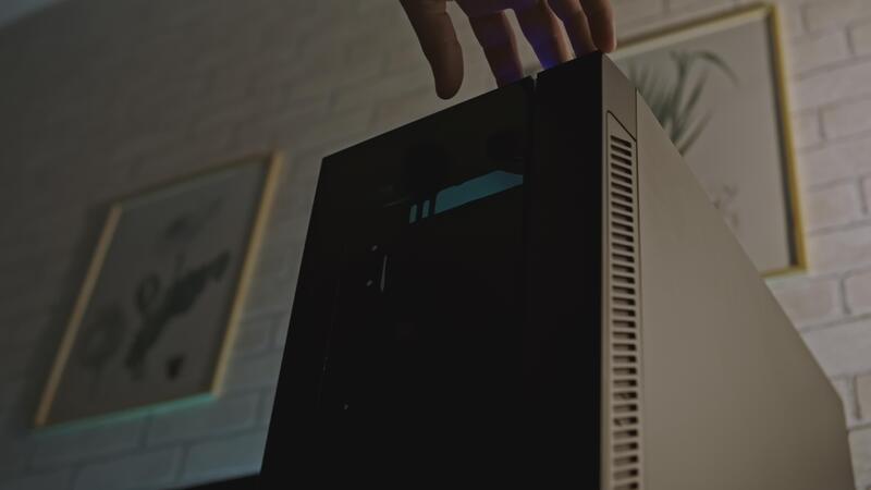 Computer with backlight. Clip. Man turns on computer with backlight inside. Beautiful stylish computer processor design with backlight for gaming and work Pro Video