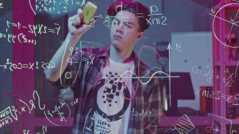 Man solves equations on transparent board. Media. Young man solves equations in closed laboratory. Man solves mathematical equations on blackboard with marker Pro Video