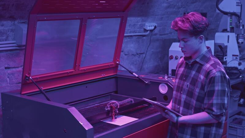 Man watches printing process. Media. Young developer monitors printer operation from tablet. Modern development of robotic printer in laboratory Pro Video