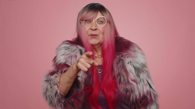 Woman pointing to camera and looking with playful happy expression, making choice, showing direction Pro Video