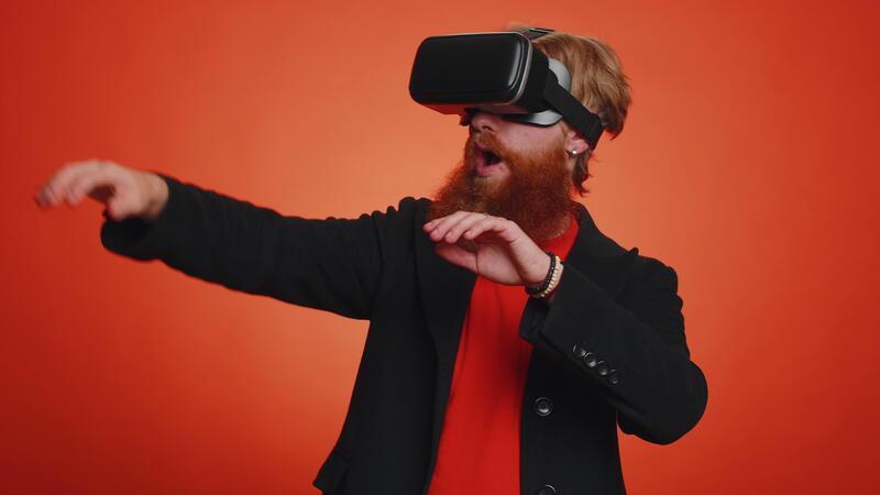 Man using virtual reality headset helmet app to play simulation innovation 3D game in VR goggles Pro Video