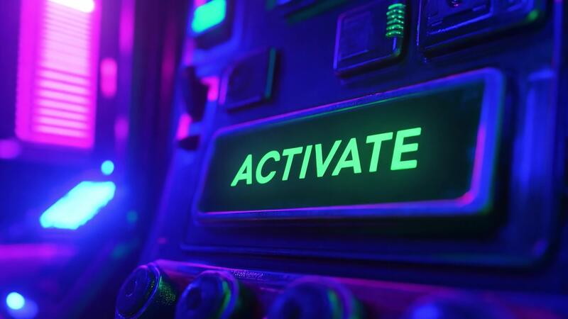 Vibrant lights illuminate a control panel with an activate button. Neon colors in the background create a futuristic atmosphere, suggesting technological action. Pro Video