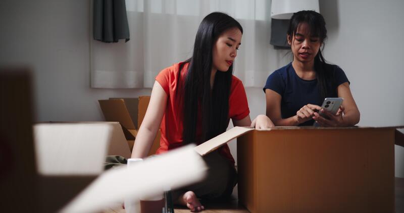 Handheld dolly shot, Two siblings happily chatting on the floor and using mobile phone to check if the items in the boxes they moved from old house are complete. Moving to a new home concept Pro Video