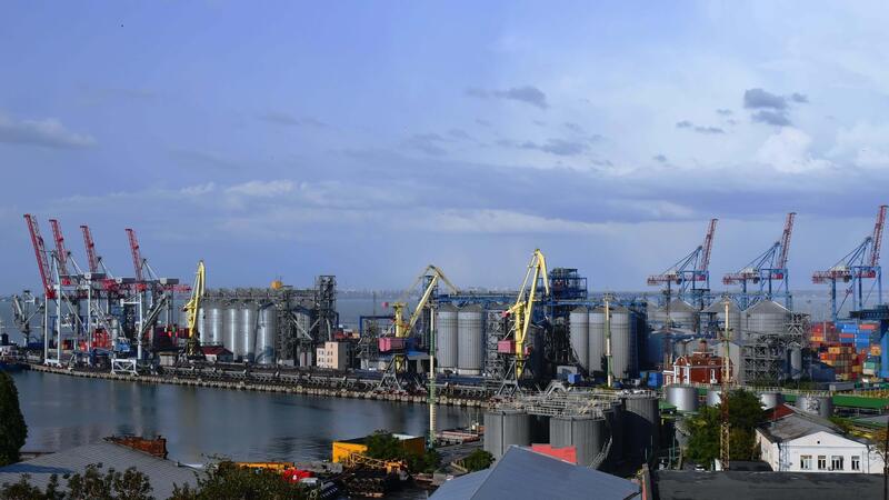 Time lapse view of industrial port and container loaders. Port landscape with moving shore cranes and grain elevators under clouds floating in blue sky Pro Video