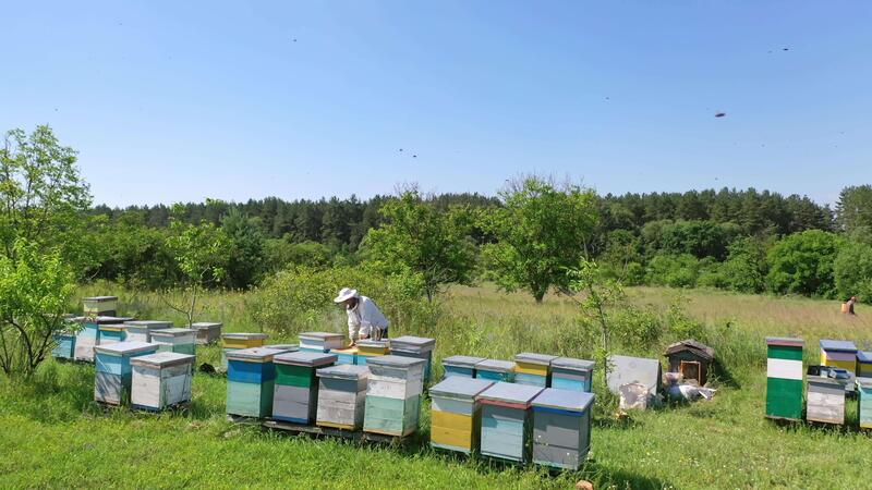 Beekeepr working on the beehive. Beekeeper working with bees and beehives on the apiary Pro Video