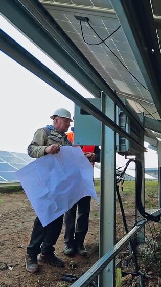 Workers installing photovoltaic panels. Technicians install the electrical system of sunny battery. View under the solar battery. Vertical Pro Video