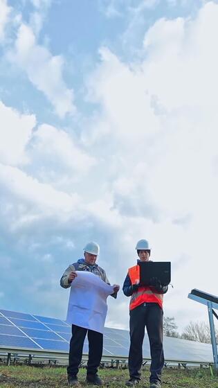 Engineers discussing blueprint on a laptop. Successful workers in protective uniform looking at plan on the background of solar panels farm. Vertical Pro Video