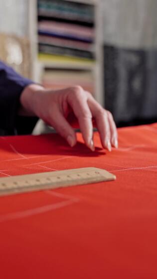 Seamstress making pattern on fabric. Dressmaker working at desk pointing with pattern Vertical Pro Video