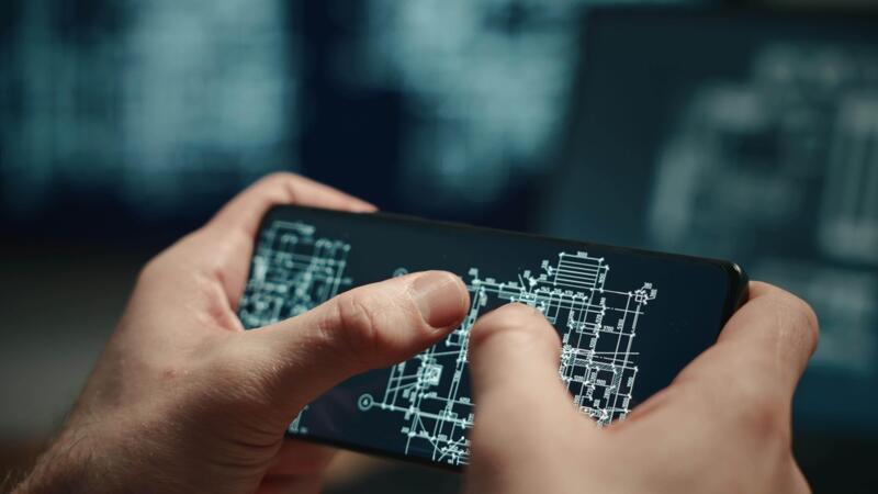 The shows male hands holding a smartphone and working on a laptop with building plans or blueprints displayed on the screens. The architect is working on a project. Pro Video
