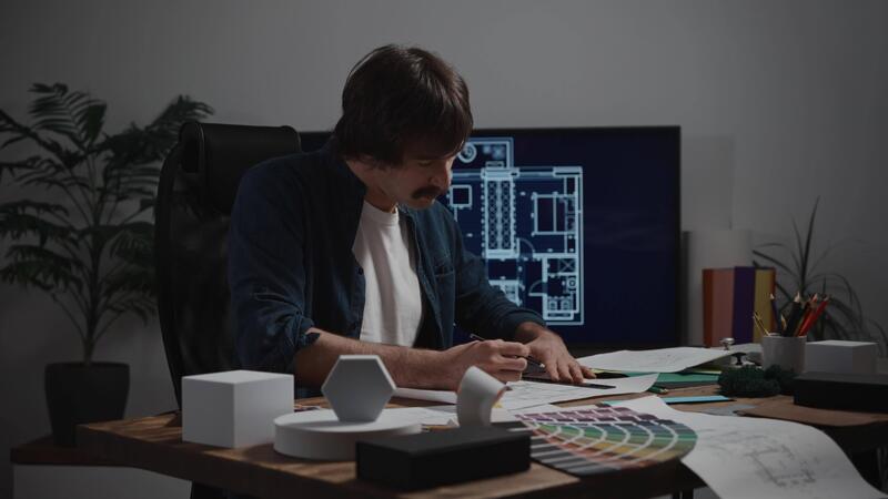 The architect designer works with drawings and samples of materials. A man at a workplace in a design studio, planning the premises. Design studio Pro Video