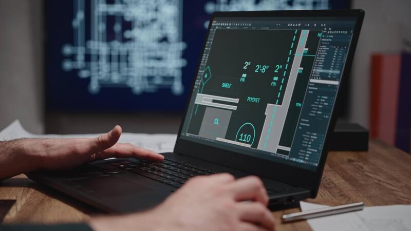 An unrecognizable architect works on a laptop with blueprints in a specialized program. The man is developing a construction project. The architect is designing a floor plan. Pro Video