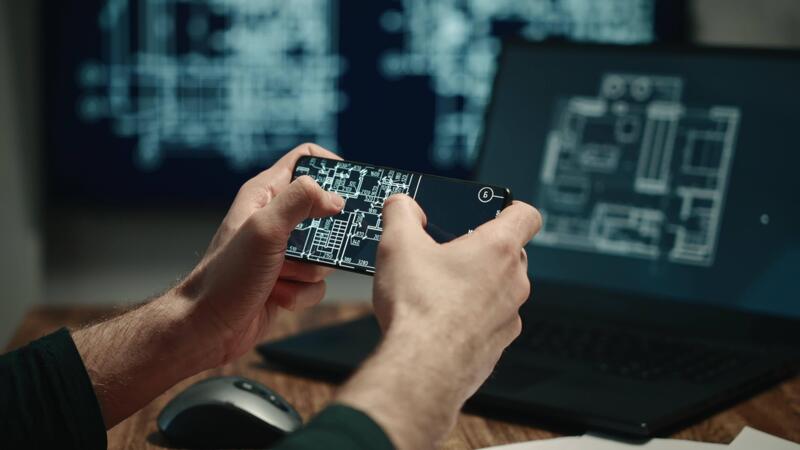 The shows male hands holding a smartphone and working on a laptop with building plans or blueprints displayed on the screens. The architect is working on a project. Pro Video