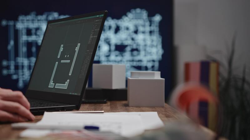 The shows male hands working with a laptop. An architect is drawing a room project using CAD software. An unidentified male engineer is working in an architectural studio Pro Video