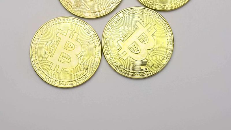 Crypto currency, bitcoin. BTC, Bit Coin. Blockchain technology, bitcoin mining. Macro shot of rotating bitcoins Free Video