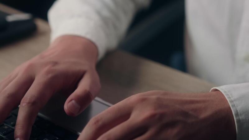 Caucasian entrepreneur man close up businessman programmer typing keyboard laptop device male company executive working in office business serious middle-aged guy developer browsing Internet network Pro Video