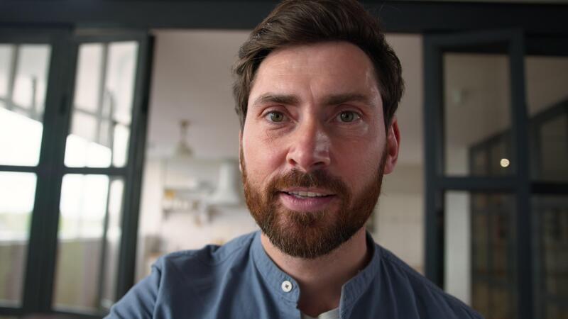 POV webcam smiling positive Caucasian man parent touching mobile phone screen happy male father dad surfing Internet web online at home guy using app swiping display smartphone device touchscreen view Pro Video