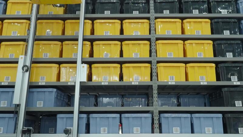Smart warehouse management system with robotic handling system. Automated robotic tote arranging distribution product stock on shelf in modern factory. AI Technology Logistic concept. Pro Video
