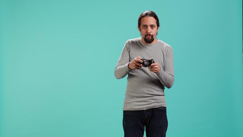 Upbeat person playing intense gaming console game, having fun, isolated over studio background. Joyous man pleased after being victorious in videogame, defeating all enemies using gamepad, camera A Pro Video