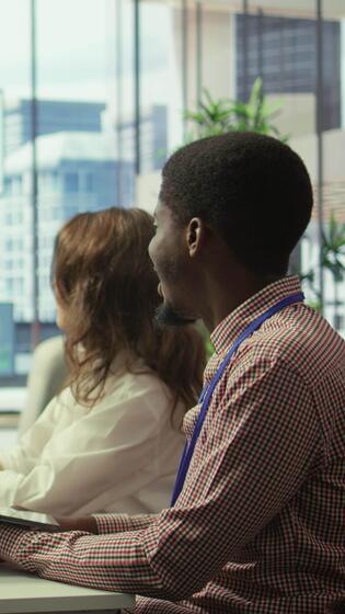 Vertical Diverse group of colleagues working together on allocating resources, attending a meeting in boardroom to review infographics and sales numbers on interactive board. Project management. Camera B. Pro Video