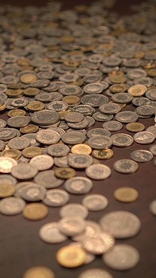 A Diverse Array of Coins Dispersed Across a Table Surface, Showcasing Their Variety and Texture Pro Video