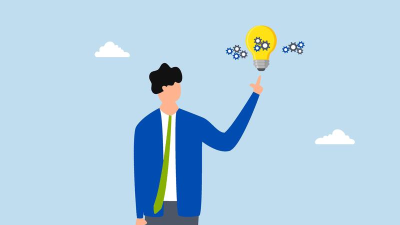 Innovation idea, 4k animation of businessman showcasing a novel lightbulb featuring cogs and gears to create new technology aimed at resolving business challenges. Pro Video
