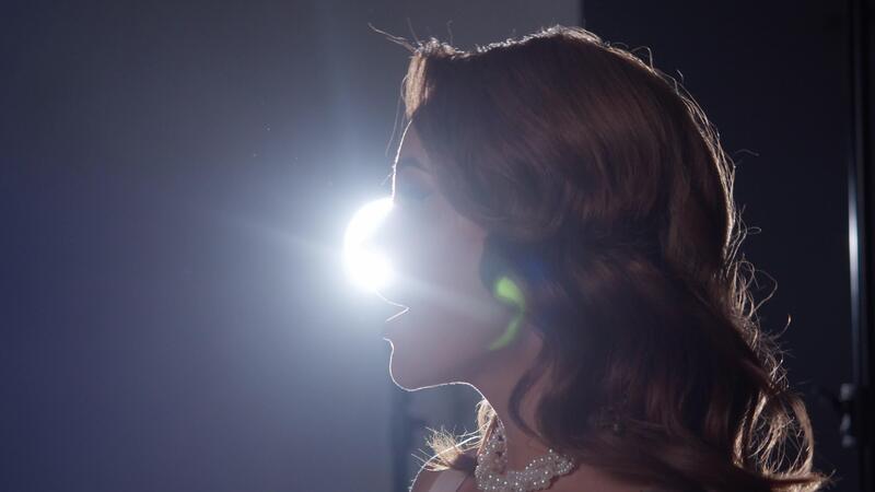 Profile of beautiful young singer is seen on abstract background, with soft light shining behind her. spotlight shines brightly, creating captivating effect. Pro Video