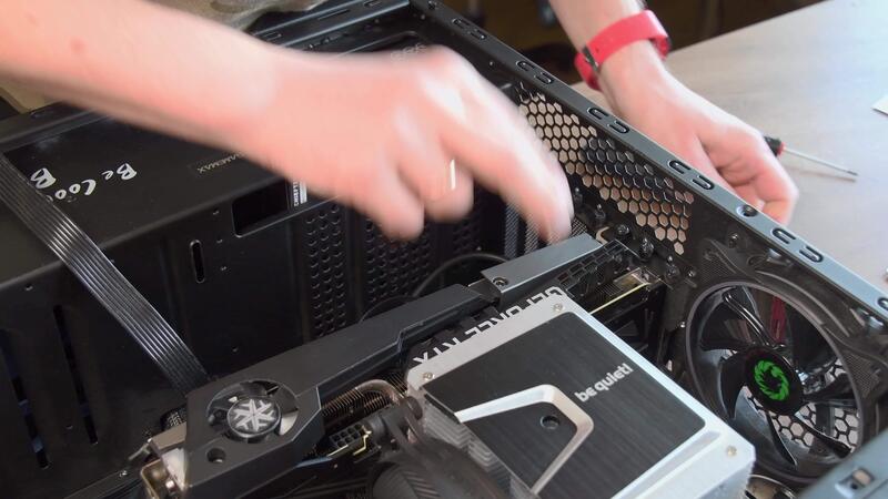 Hands with screwdriver assemble CPU cooler and NVidia GeForce RTX 3080 graphics card in PC. Then check power supply cable plugs before connecting into GPU. Mining hardware. Odessa, Ukraine, 04 07 2021 Pro Video