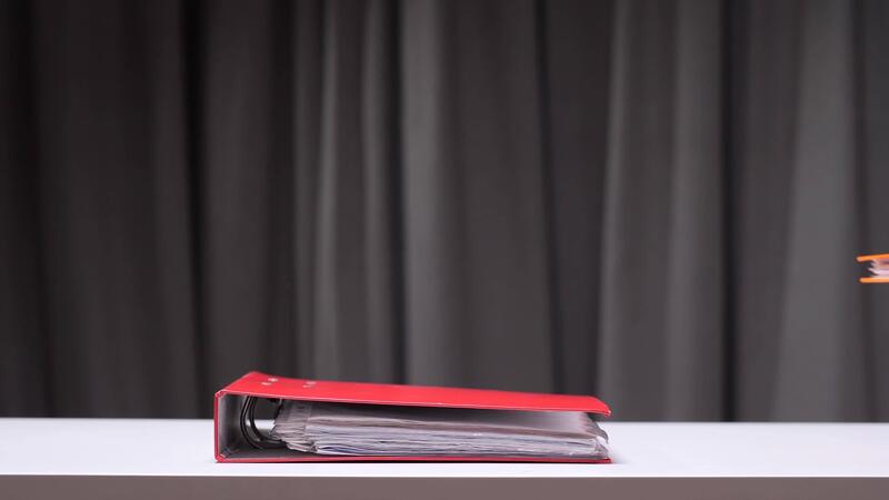 office worker puts a stack of multi-colored folders with documents on his desk Pro Video