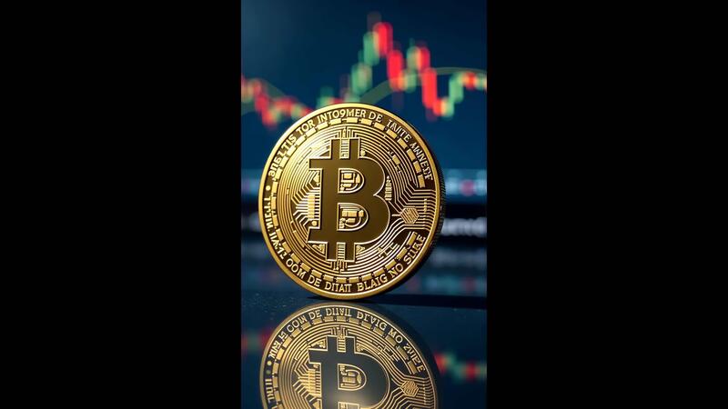 Close-up of golden bitcoin coin with its reflection, set against blurred cryptocurrency trading chart featuring red and green candlesticks, symbolizing blockchain technology and digital finances Pro Video