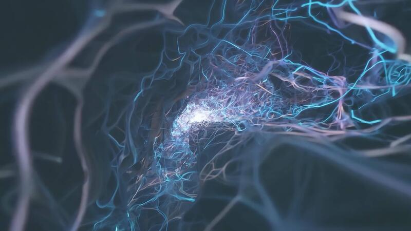 Blue and purple energy flows through a complex network of nodes, creating a dynamic and abstract digital landscape Free Video