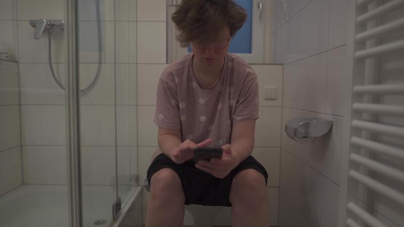 Woman is addicted to internet, sits on toilet for long hours and uses smartphone. Female sits long hours on WC and scrolls internet and gets hooked on social media. Everyday online dependency. Pro Video