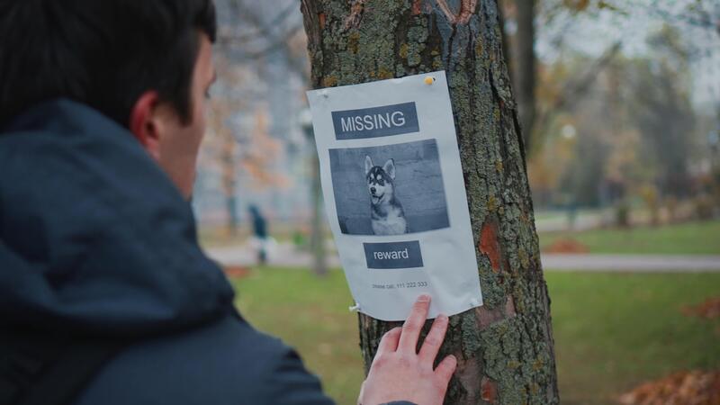 Man walking in park saw message on tree about missing dog, takes photo on his phone to remember and call if he sees missing dog. Male makes photo of a lost dog posting in a tree post in the park. Pro Video