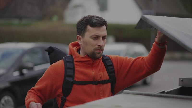 Man throws trash in clear garbage bag with biologicals food waste into garbage can near home before go to work in Europe. Garbage sorting. Containers for waste separation. Environmental conservation. Pro Video